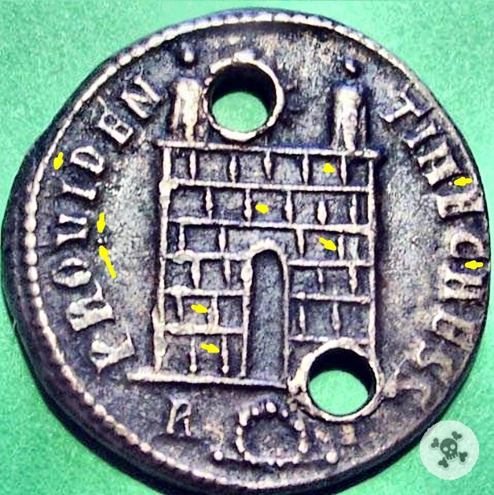 La lettura del carattere grafico dopo la corona è compromessa da uno dei fori. E' verosimile che si tratti di una "T" della quale residua l'asta verticale che farebbe classificare la moneta come RIC VII, Roma, 288-289. | |