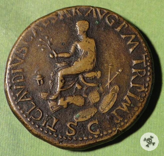 Trattasi di copia probabilmente ottocentesca di un sesterzio di Nerone Claudio Druso. La superficie presenta una sorta di patina bruna (cera?). Messa in vendita da Casa d'asta spagnola nel novembre 2012.