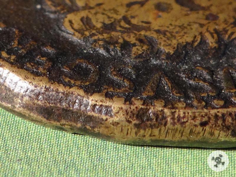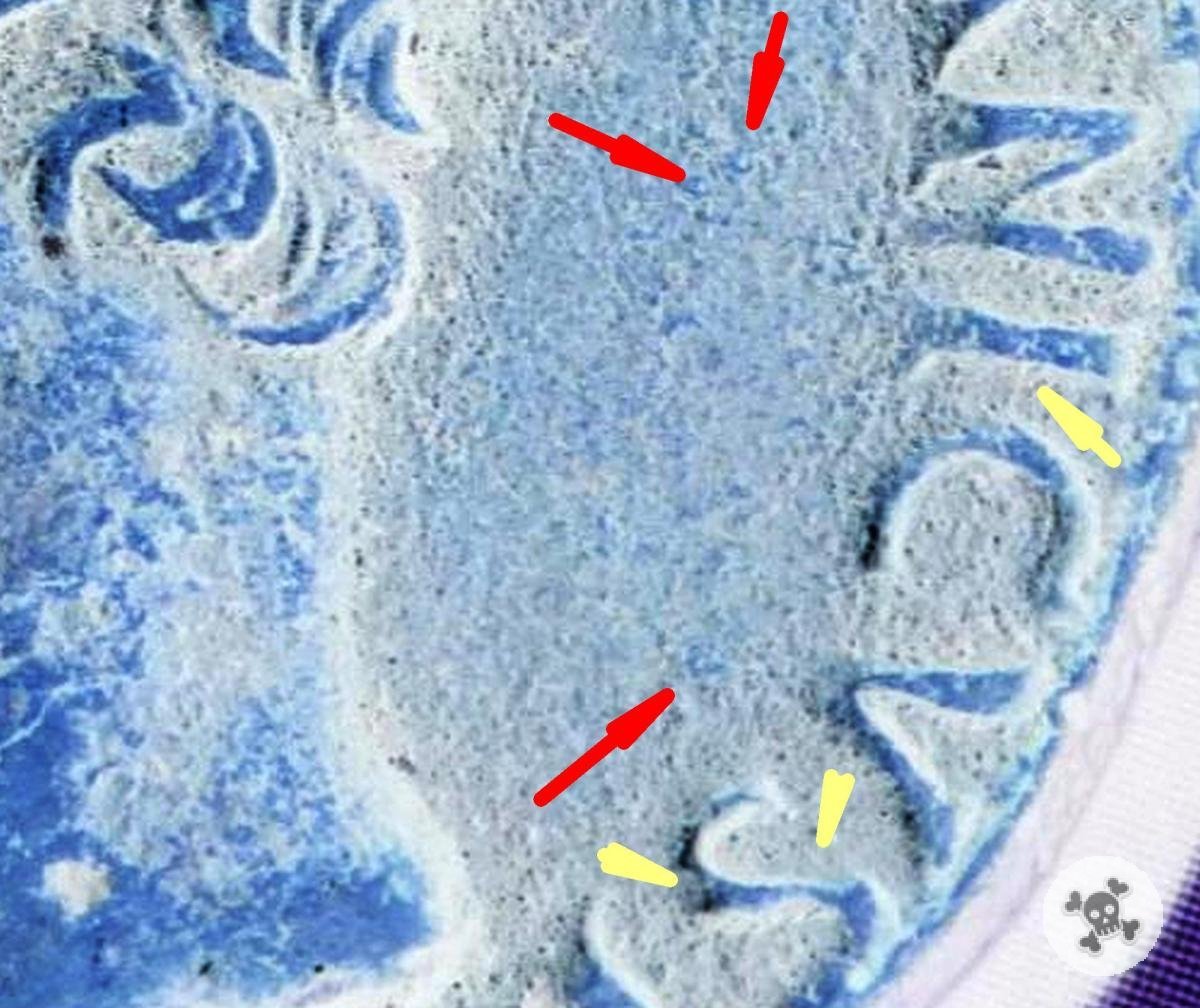La superficie monetale presentante microbolle da fusione e la limatura del codolo di fusione e verosimilmente del bordo di congiunzione delle matrici rafforza l'ipotesi dell'origine per fusione. Nello specifico si veda il dettaglio fotografico delle abrasioni sul brodo e l'immagine dei campi filtrata e rielaborata. |