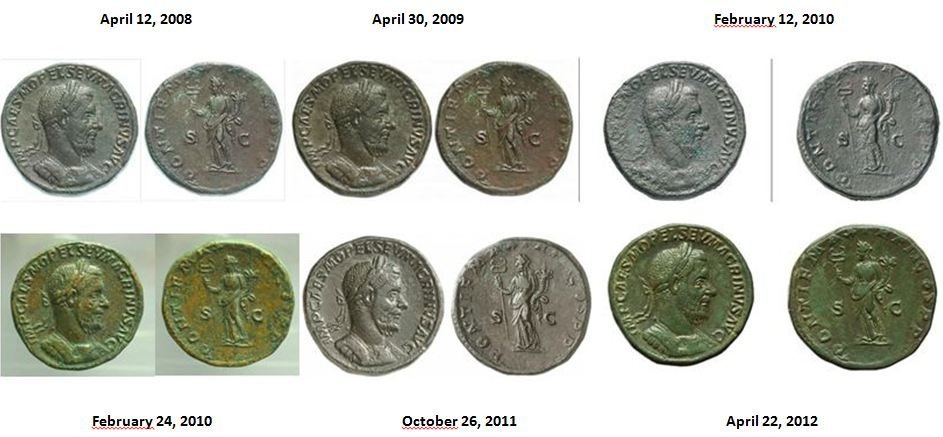 | In seguito a una segnalazione da parte di un utente del Forum sono state svolte ricerche sul web che hanno portato all'individuazione di ben 6 cloni della moneta (RIC 146) passati in aste internazionali (dal 04/2008 al 04/2012). L'identificazione si basa sulla presenza di una doppia battitura della P di PONT al rovescio e su una tacca al bordo a ore 4 del dritto. Talvolta è presente una lacuna sulla guancia o sulla fronte di Macrinus. AGGIORNAMENTO: nel maggio 2013 è stata rimessa in asta (ritirata dalla Casa d'Asta dopo ns. segnalazione) una delle 6 monete suddetta, risultata al'epoca invenduta. | |||
